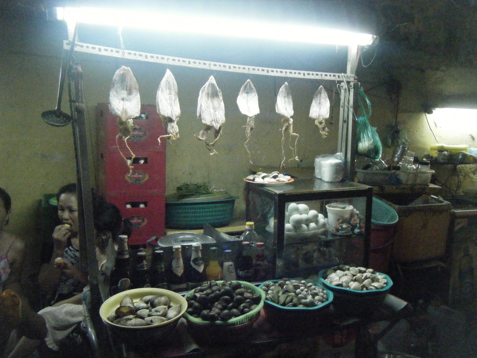 That same night, we saw the coolest little stand. They had dried squid hanging at the top and then bowls of water with various clams and snails in them just waiting for you to ask for them to be cooked up for a late night snack. Cool!